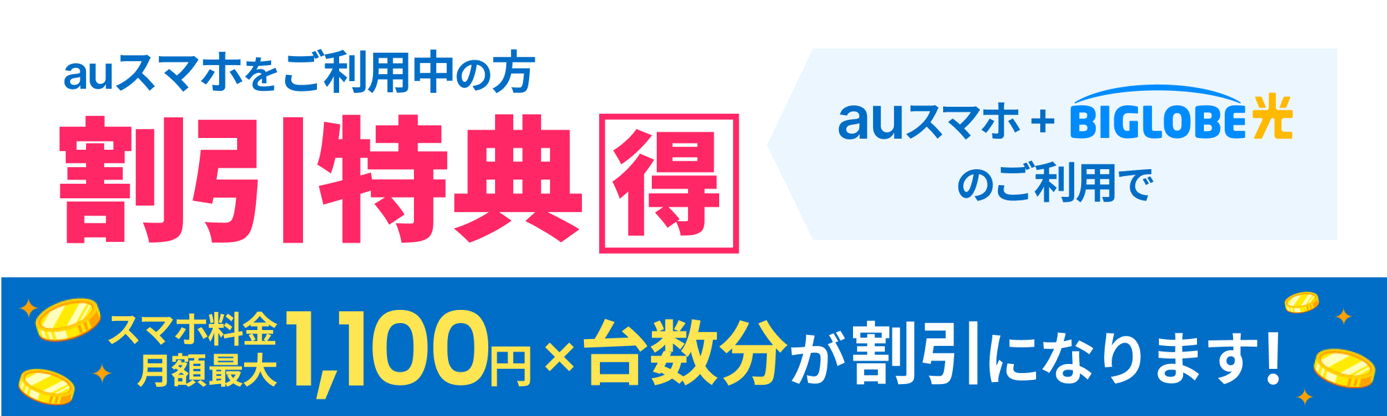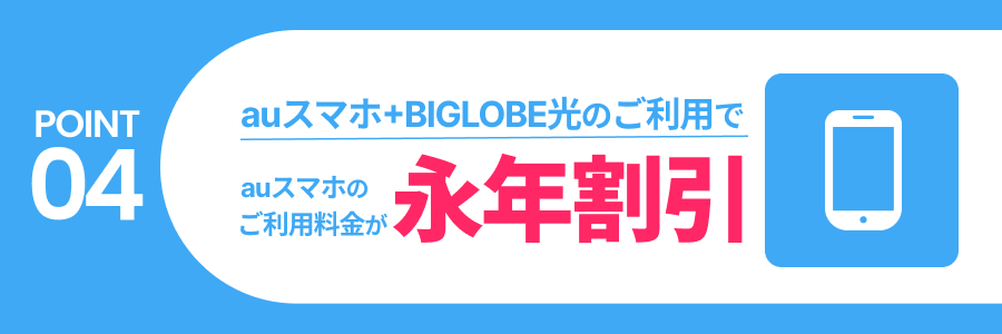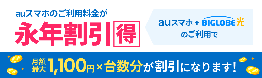 ※KDDIが提供するサービスです。値引き適用には「auスマートバリュー」と「BIGLOBE光(ネット+電話)」のお申し込みが必要です。