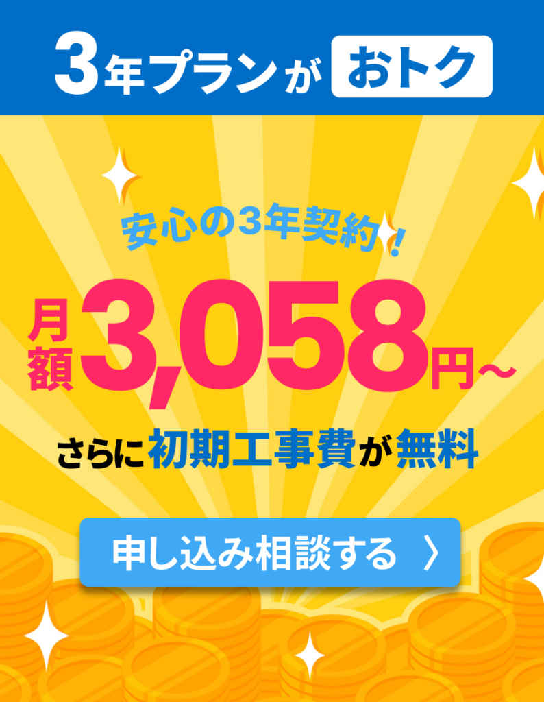 ※ 工事費は28,600円(土日休日の工事は31,900円)。一括払い、または分割払いでお支払いいただくことができます。分割払いの場合、初回880円/月、2ヶ月目から792円/月の35回払い、計36回払いとなります。分割払いの途中で残額を一括でお支払いいただくことも可能です。