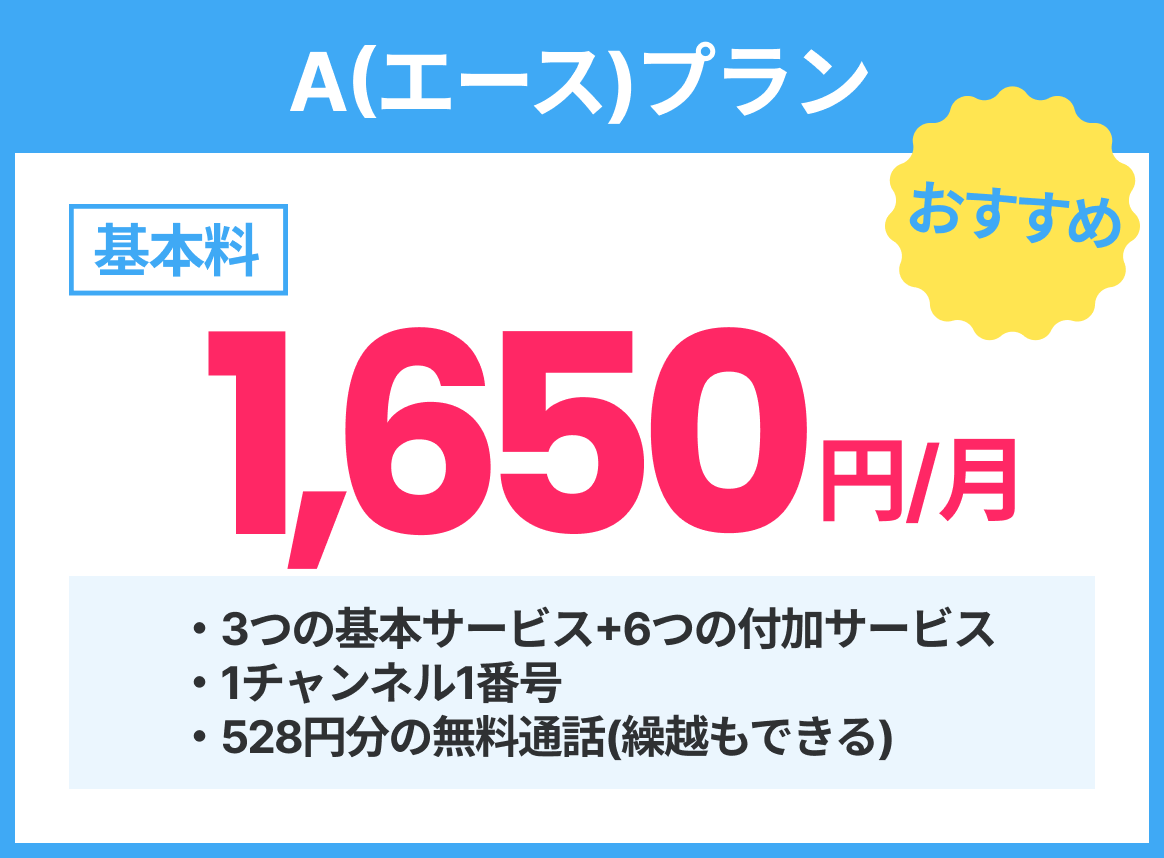 • A(エース)は、月額料金で「528円分」の通話がご利用いただけます。余った通話分は翌月に繰越可能です。