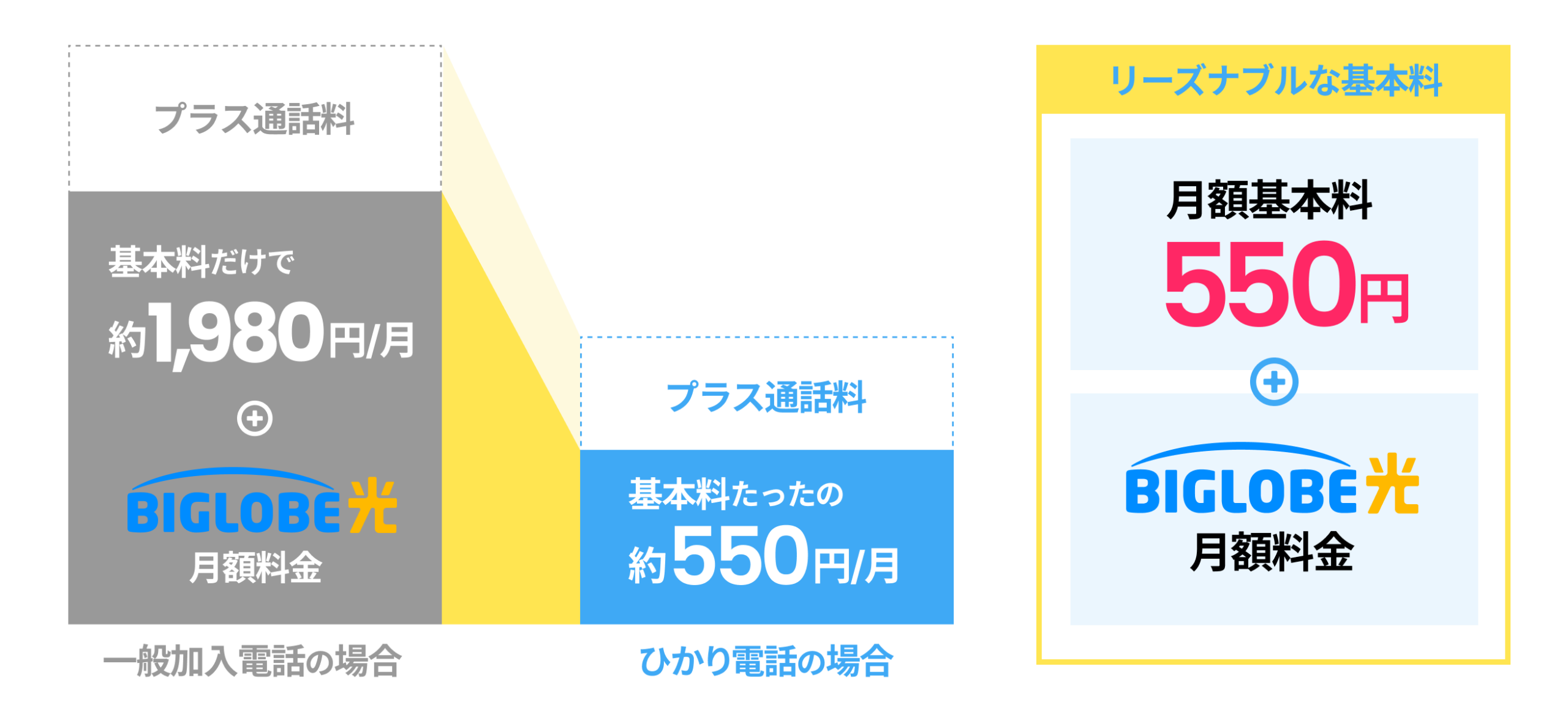 BIGLOBE光電話を利用すれば、通話料がおトクに!お客さまのご利用状況に合わせた2つのプランをご用意!格安550円からご利用できます!